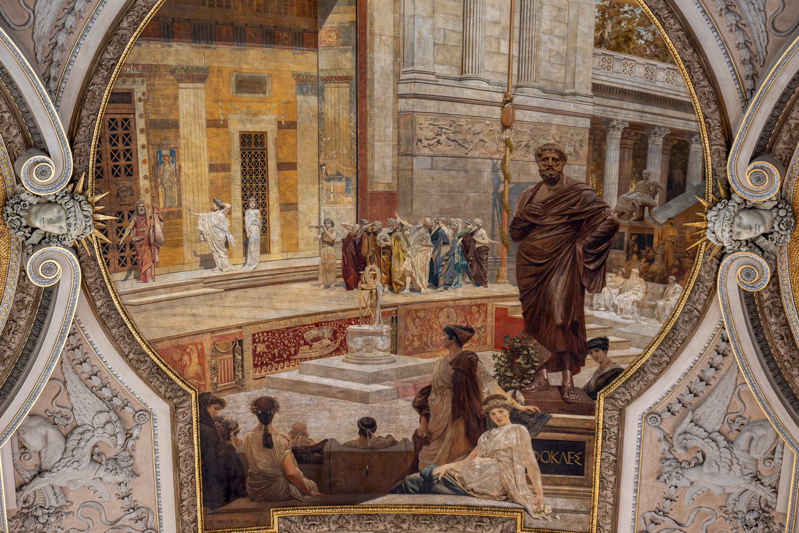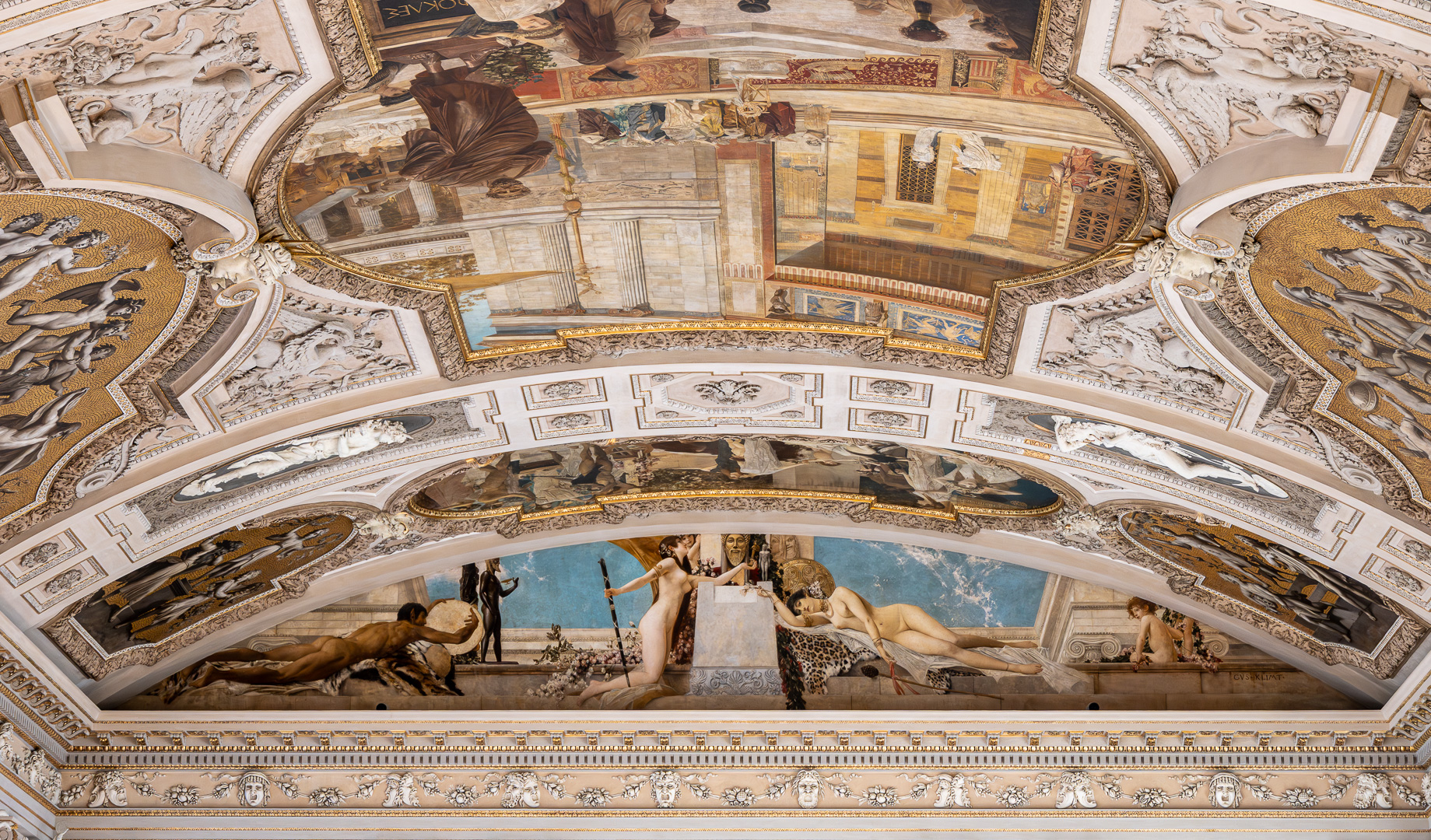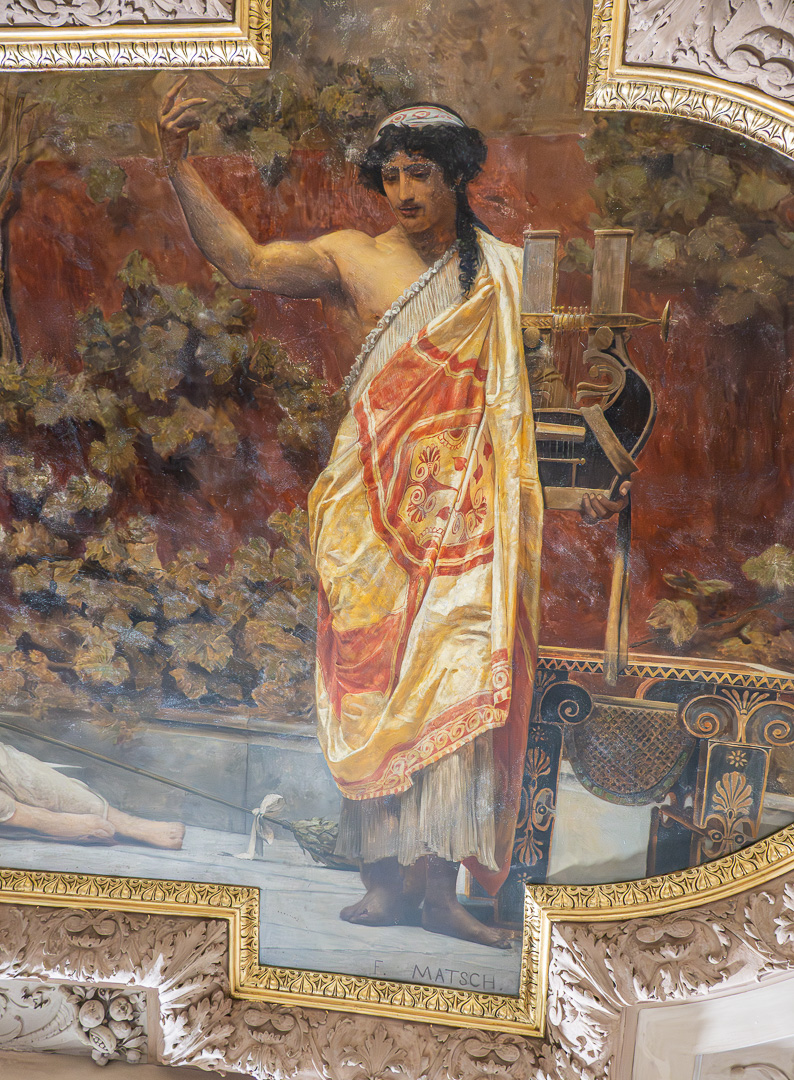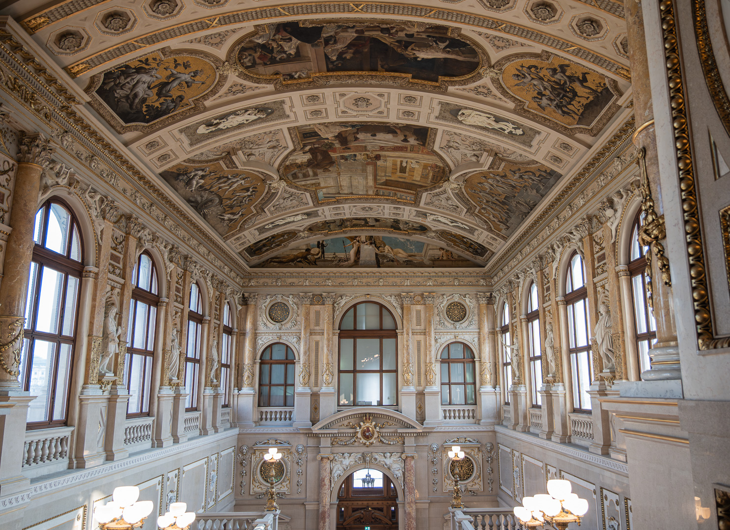 Die Ausmalung der Decke in den beiden seitlichen Stiegenhäusern ging an die Künstler-Compagnie von Franz Matsch, Gustav und Ernst Klimt und war der erste große Staatsauftrag in Wien für die drei. Die Künstler-Compagnie empfahl sich durch vorherige Aufträge für Theater in Karlsbad, Reichenberg und Fiume, besonders aber durch die Ausstattung der Hermesvilla.