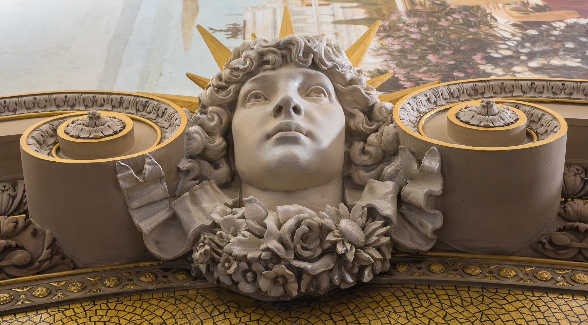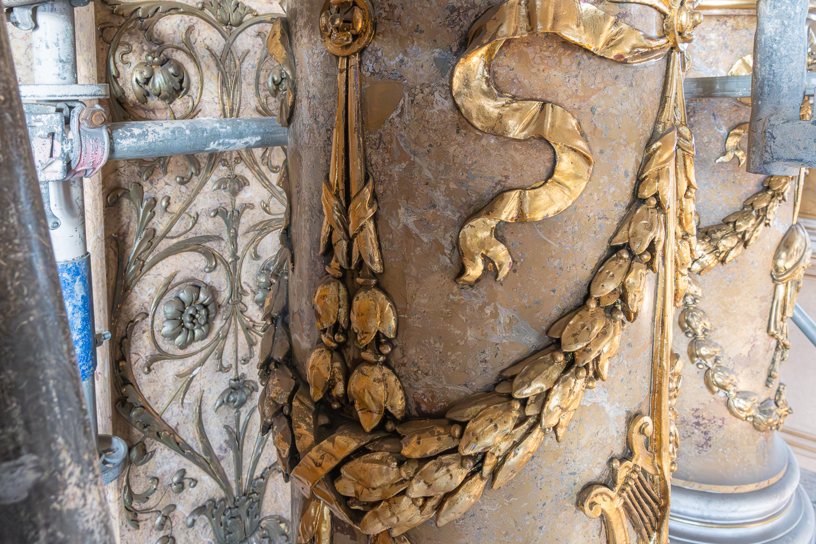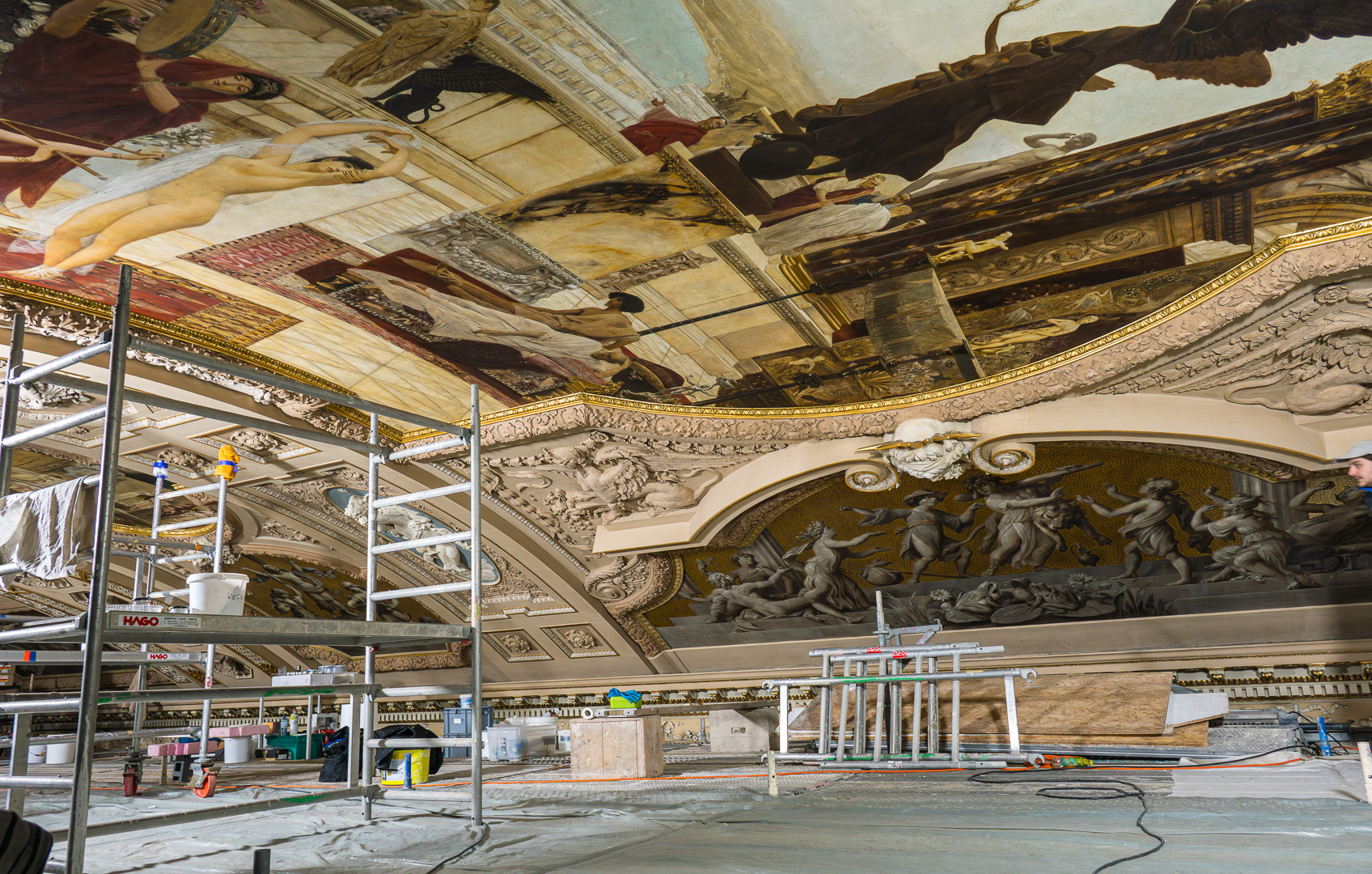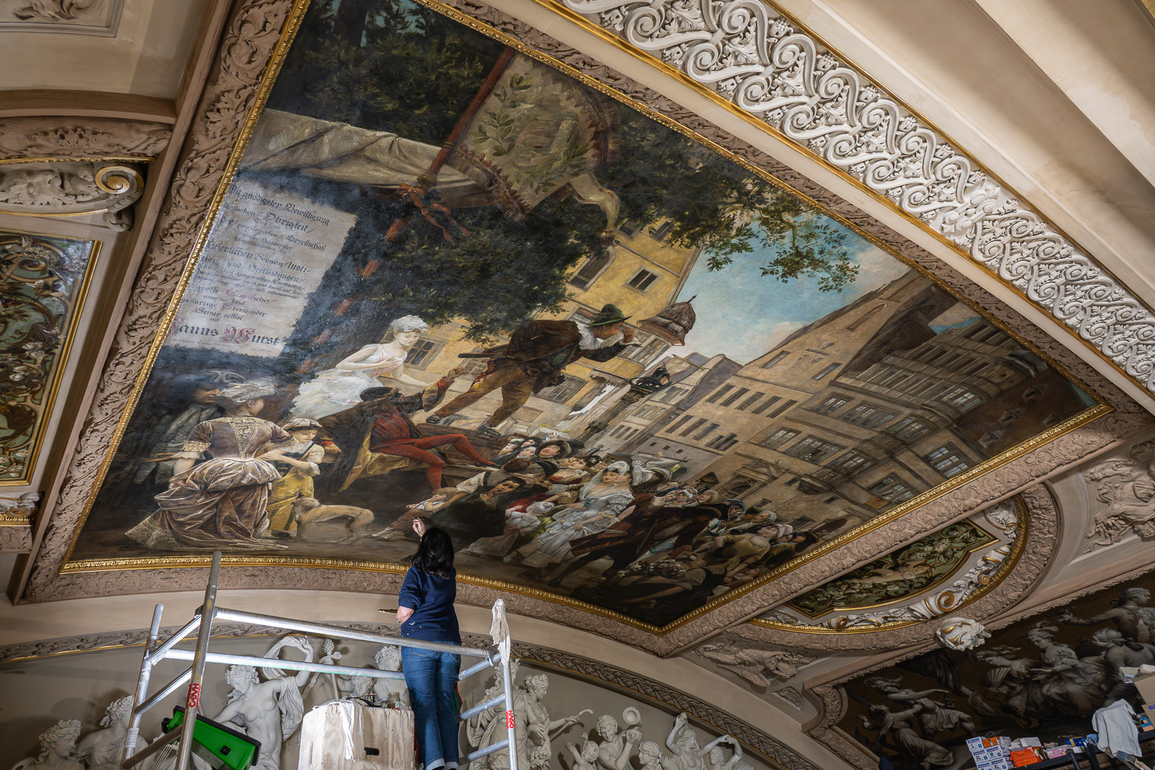 Bei unserem Besuch ist das Deckengemälde der rechten Feststiege schon fertig renoviert, das auf der linken Feststiege ist gerade in Arbeit.