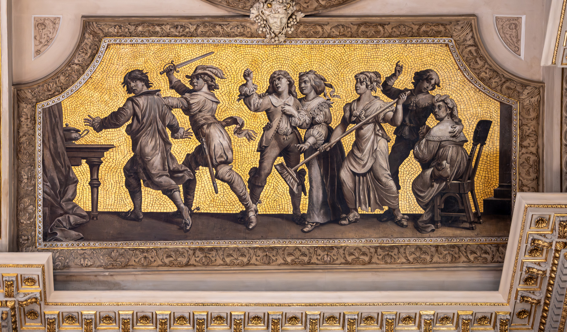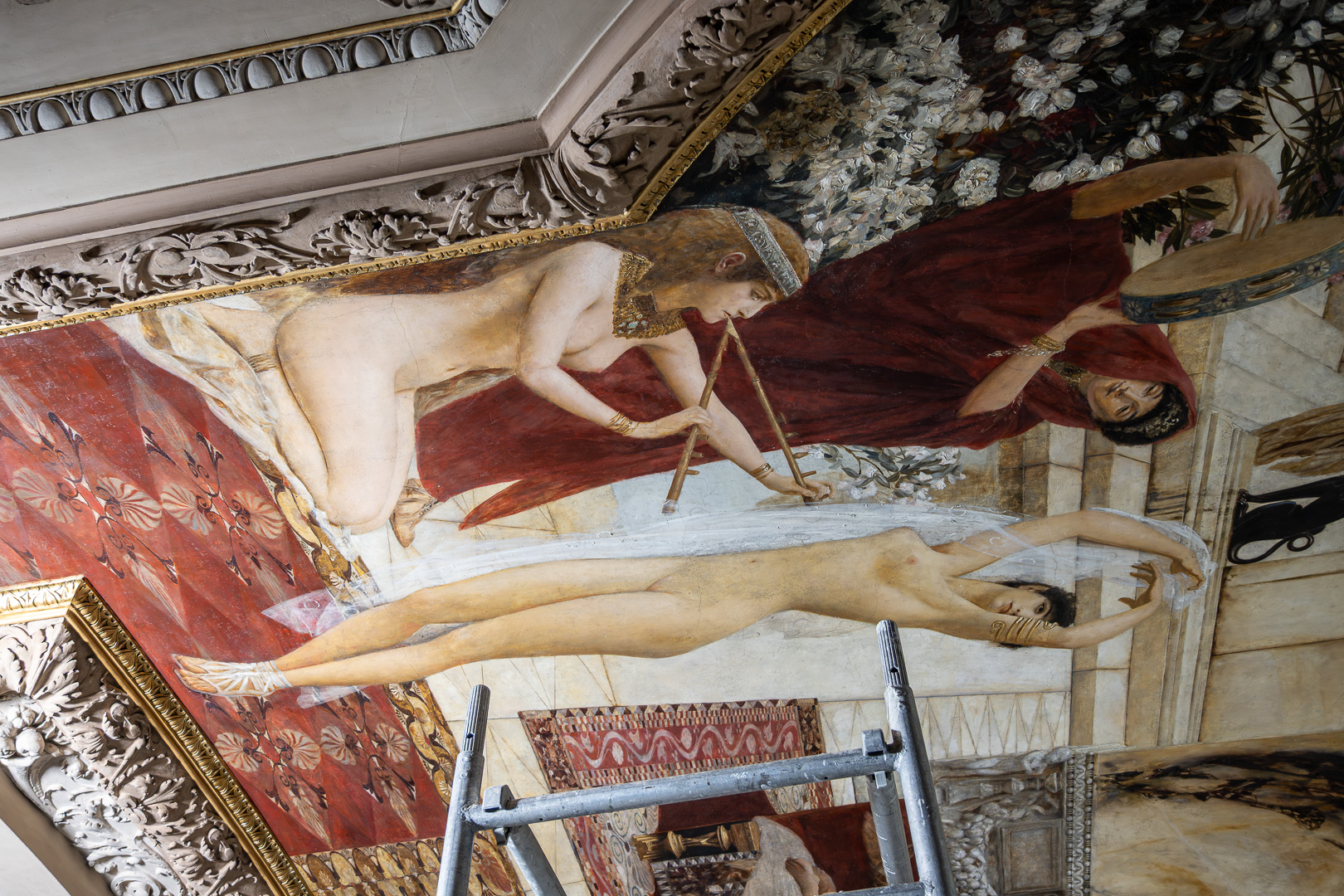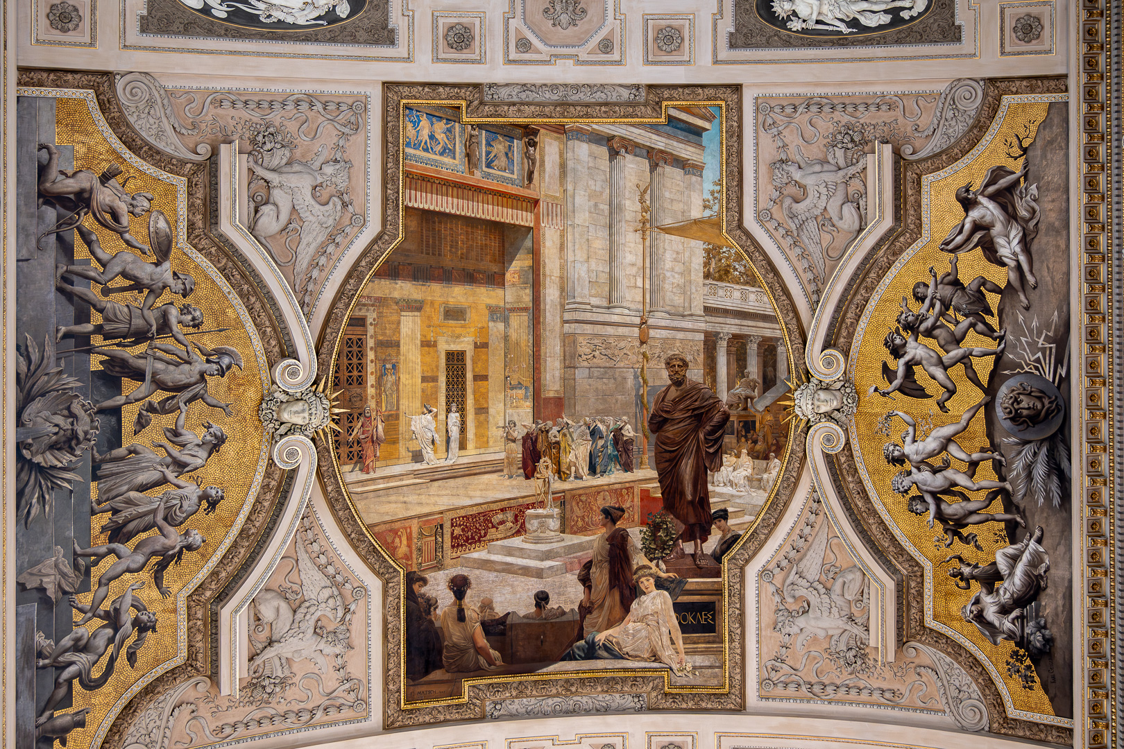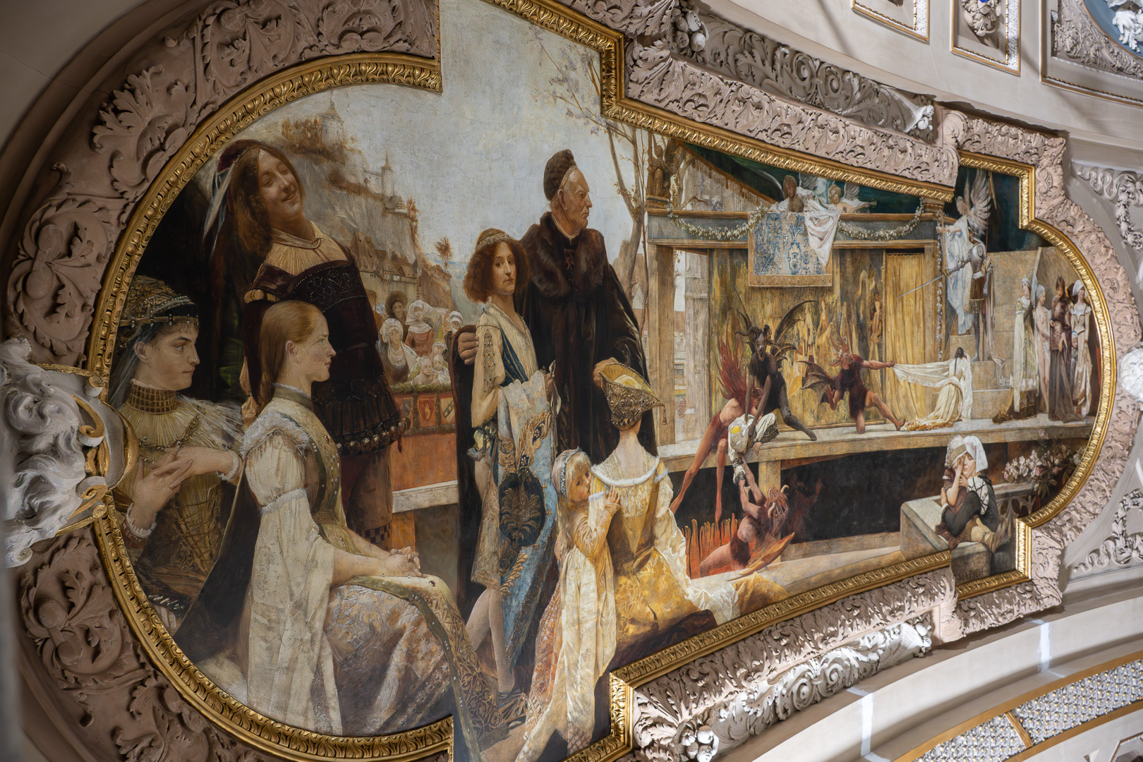 Die Gemälde sind von 1886 bis 1888 entstanden, wobei die acht Gemälde an der Decke vorgegeben waren, die Segmentgemälde konnten die Künstler frei wählen. Außergewöhnlicherweise sind auch die Entwurfszeichnungen zu den Gemälden teilweise vorhanden – was einen schönen Einblick in die akribische Vorzeichnung von z.B. Gustav Klimt erlaubt! Der Auftrag wurde zur vollsten Zufriedenheit Kaiser Franz Josephs ausgeführt, der die Künstler neben dem Honorar mit dem Goldenen Verdienstkreuz auszeichnete – ein enormer Prestigegewinn für die junge Künstler-Compagnie.