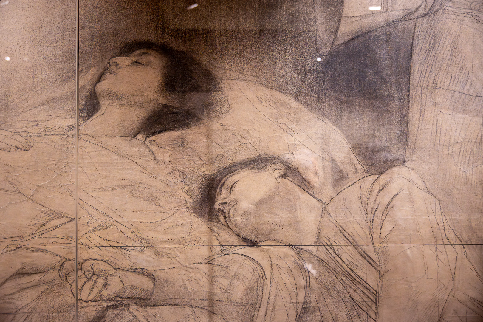 Bei unserem Besuch konnten wir auch einige der ausgestellten Entwurfskartons studieren und durch die Pausengänge mit den Bildnissen berühmter Schauspieler:innen wandern. An den originalgroßen Entwurfskartons sind noch die Lochungen entlang der Linien zu sehen, mit deren Hilfe die Skizze auf den Malgrund übertragen wurden.
