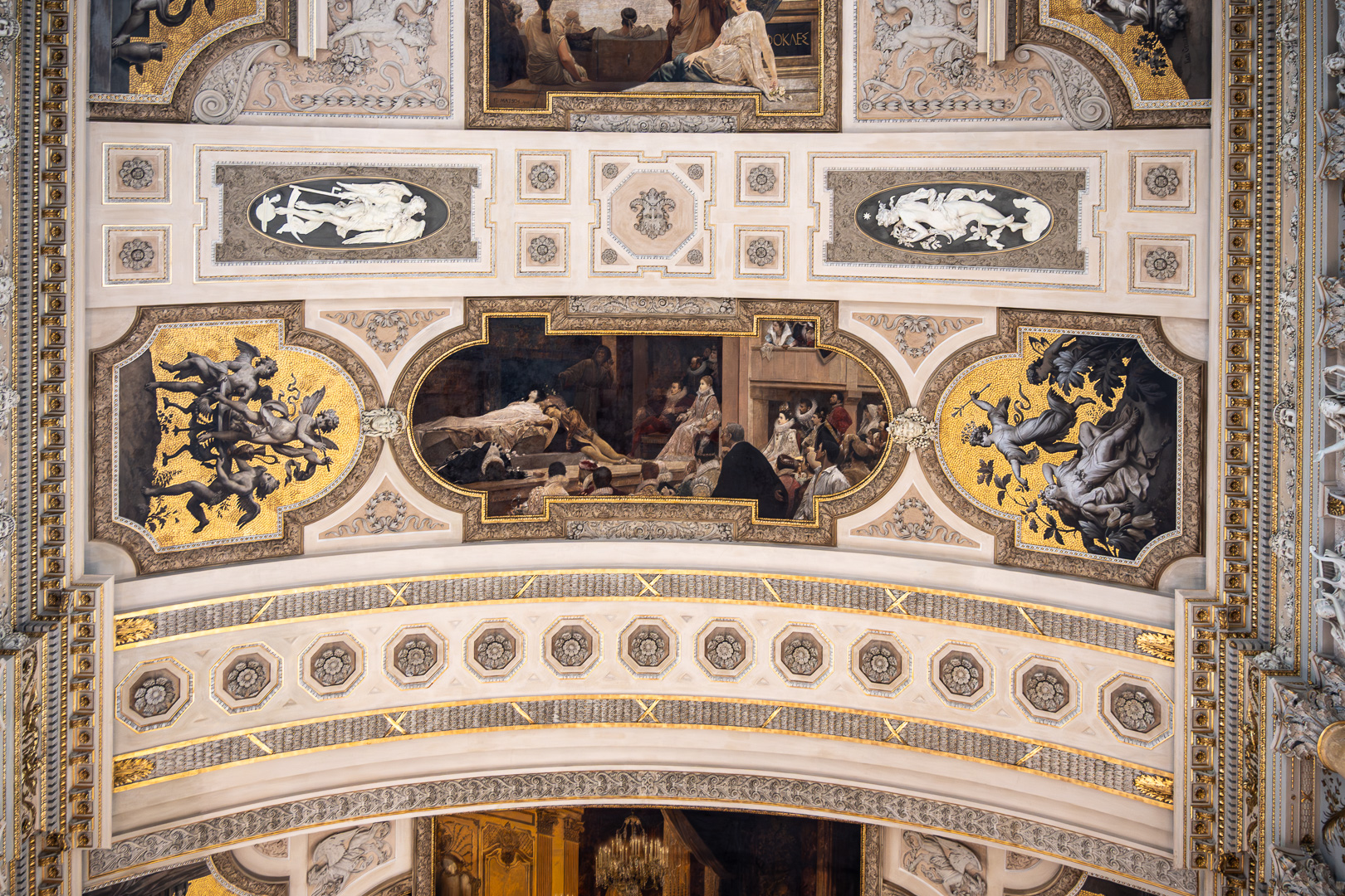 Die Seiten der Decken sind mit Malereien von Carl Geiger in Grisailletechnik (nur in Grautönen) mit einem ein Goldmosaik imitierenden Hintergrund ausgeführt.