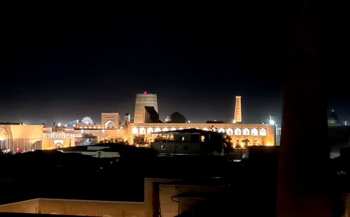 Der Lyabi-Hauz Platz mit seinem großen Becken, an dem eine Chanaka (Pilgerherberge) und gegenüber eine Karawanserei steht, wurde vom Großwesir Nodir Devon Begi im 17. Jahrhundert erbaut. Die Medrese dazwischen ist 50 Jahre älter und war in der Sowjetzeit in ein Hotel für Baumwollarbeiterinnen und -arbeiter umgewandelt worden (einschlägige Fresken zeugen davon). Jetzt dient es als Touristenbasar. Auf dem Platz steht auch eine Statue von Hodscha Nasreddin, einem türkisch-persischen Spaßmacher.