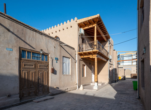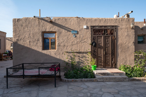 Wir wohnen in einem kleinen Hotel außerhalb der Altstadt, in einem typischen Wohnviertel mit eingeschoßigen Häusern und dem Taptschan, der Essplattform vor der Haustür.