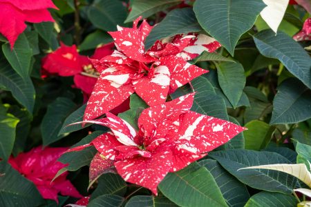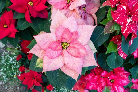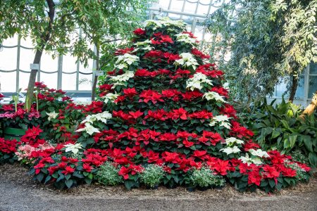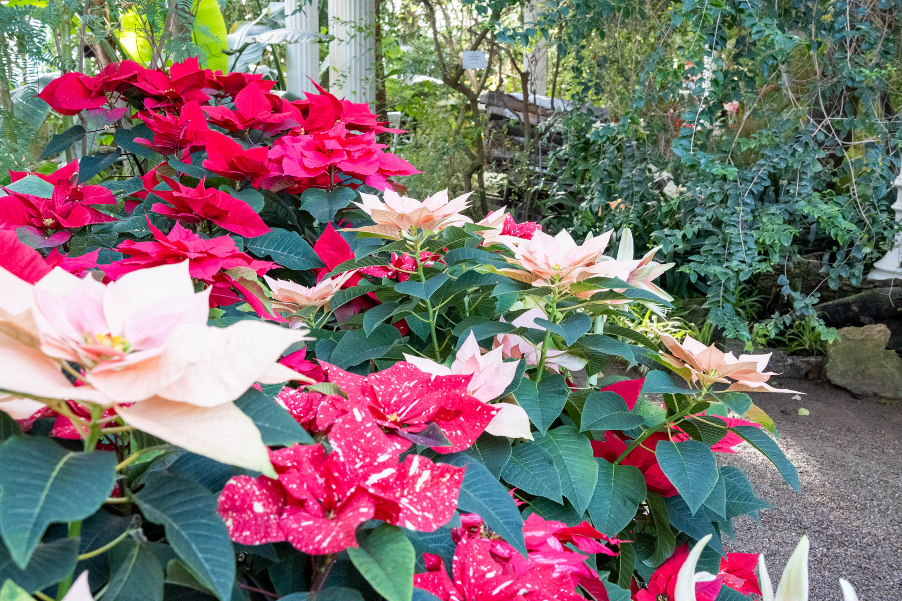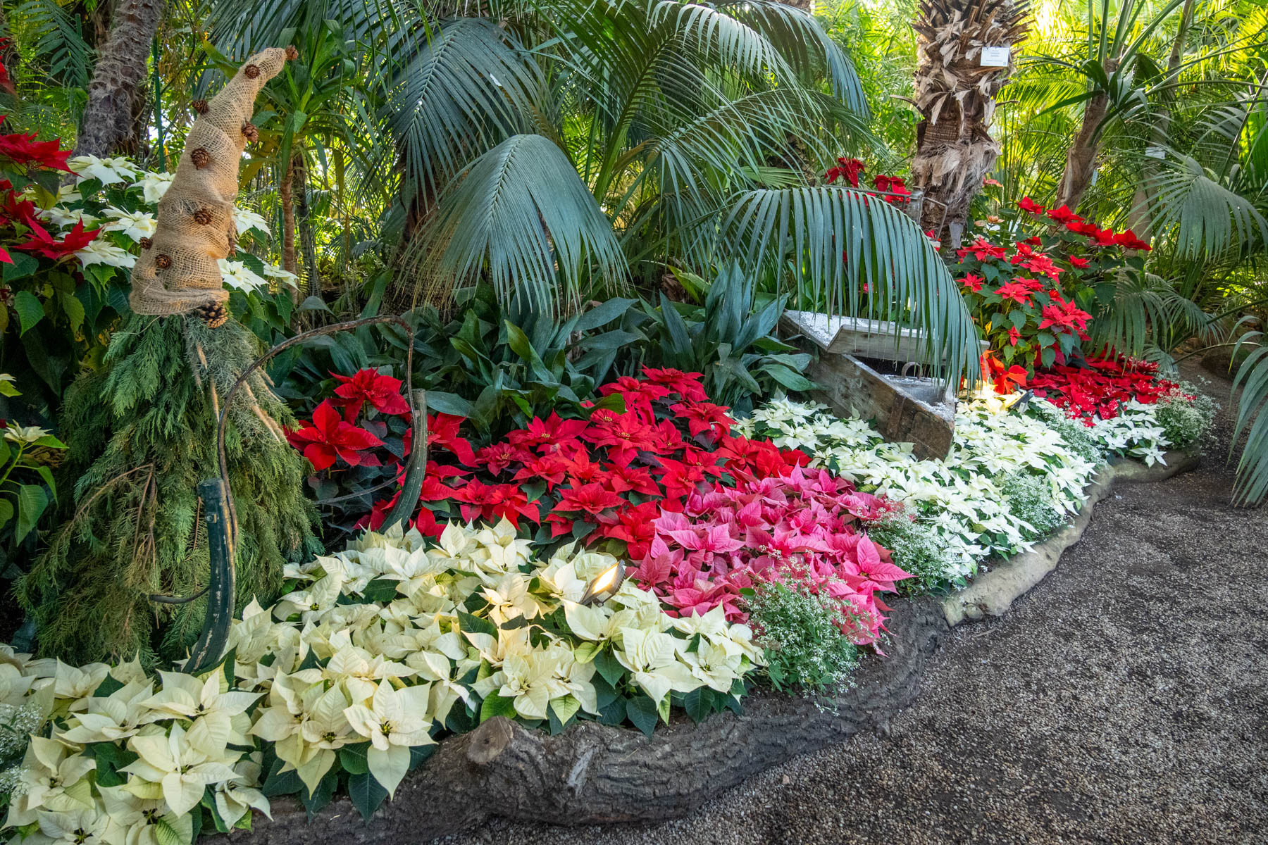 Im Palmenhaus sieht man üppige Arrangements mit verschiedenfarbigen Weihnachtsternen, eine Farbenexplosion in Rot, Weiß und Rosa! Dazwischen setzen großblütige Amaryllis in ähnlichen Farbenspektren Akzente.