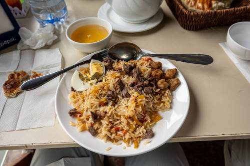 Das Essen in Usbekistan ist sehr fleischlastig. Nationalgericht ist Pilav, Reis mit Fleisch und Karotten und Zwiebeln. Das Standardgetränk ist Grüner Tee. Traditionell wird am Taptschan sitzend gegessen, eine Plattform, die mit Sitzpolstern um einen niedrigen Tisch herum belegt ist.